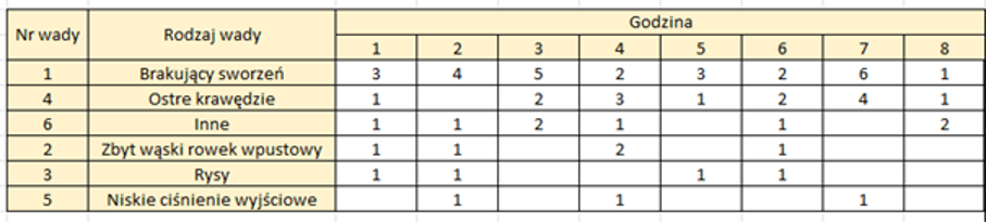 Wykorzystajmy arkusz kalkulacyjny do budowy Diagramu Pareto. Aby to zrobić w pierwszej kolejności dodajmy niezbędne dane do tabeli.
