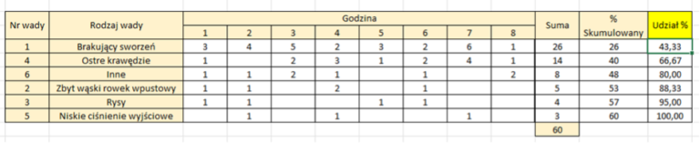 - Oblicz udział procentowy i skumulowany: dla każdej przyczyny oblicz jej procentowy udział w całości problemu, a następnie oblicz skumulowany procent, dodając kolejno udziały procentowe.