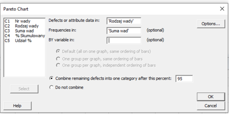 Wprowadzić niezbędne informacje w zakładce „Pareto Chart” w pakiecie statystycznym:
