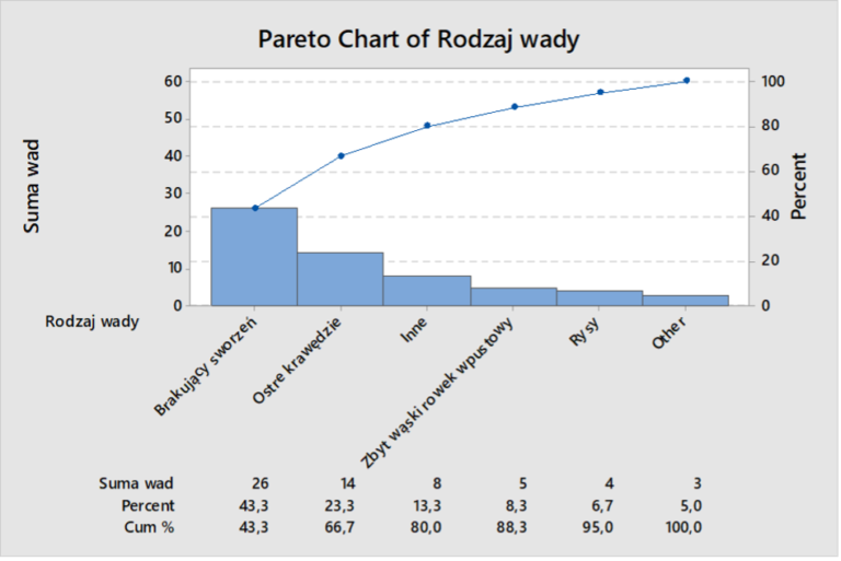 - Biorąc pod uwagę dwie pierwsze wady tj. „brakujący sworzeń” oraz „ostre krawędzie” – stanowią one już 66,7% wszystkich wad.