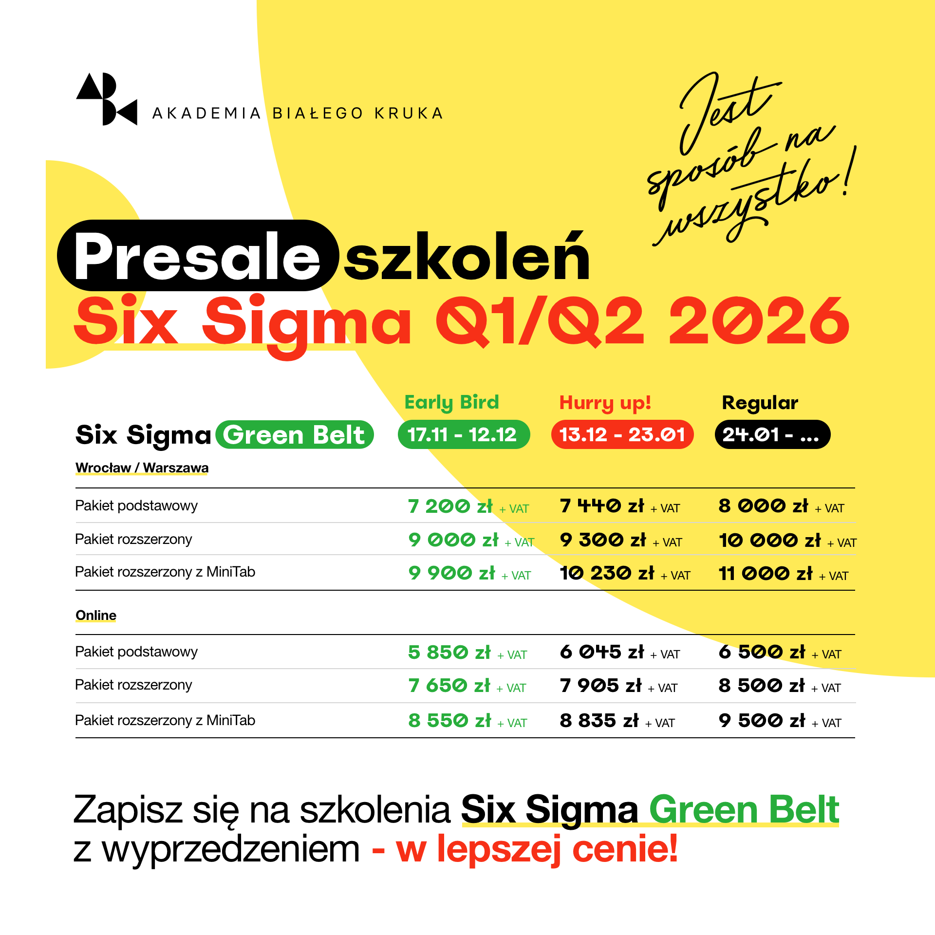 “Po kursie Six Sigma Green Belt naprawdę uwierzyłem, że JEST SPOSÓB NA WSZYSTKO! Dzięki profesjonalizmowi i nieprzeciętnej osobowości trenerów Akademii Białego Kruka szkolenie to jest najlepsze spośród szkoleń, w których miałem okazję uczestniczyć. Ciekawie prowadzone zajęcia, dużo przykładów praktycznych, wspólna powtórka z omawianej części teoretycznej po skończonym module szkolenia co pozwala na szybkie przyswojenie i utrwalenie wiedzy.
